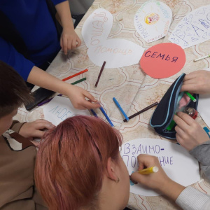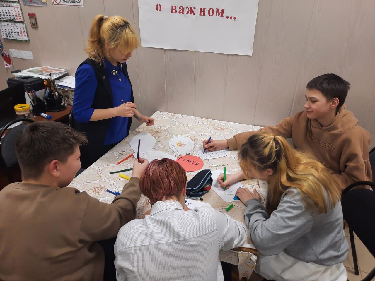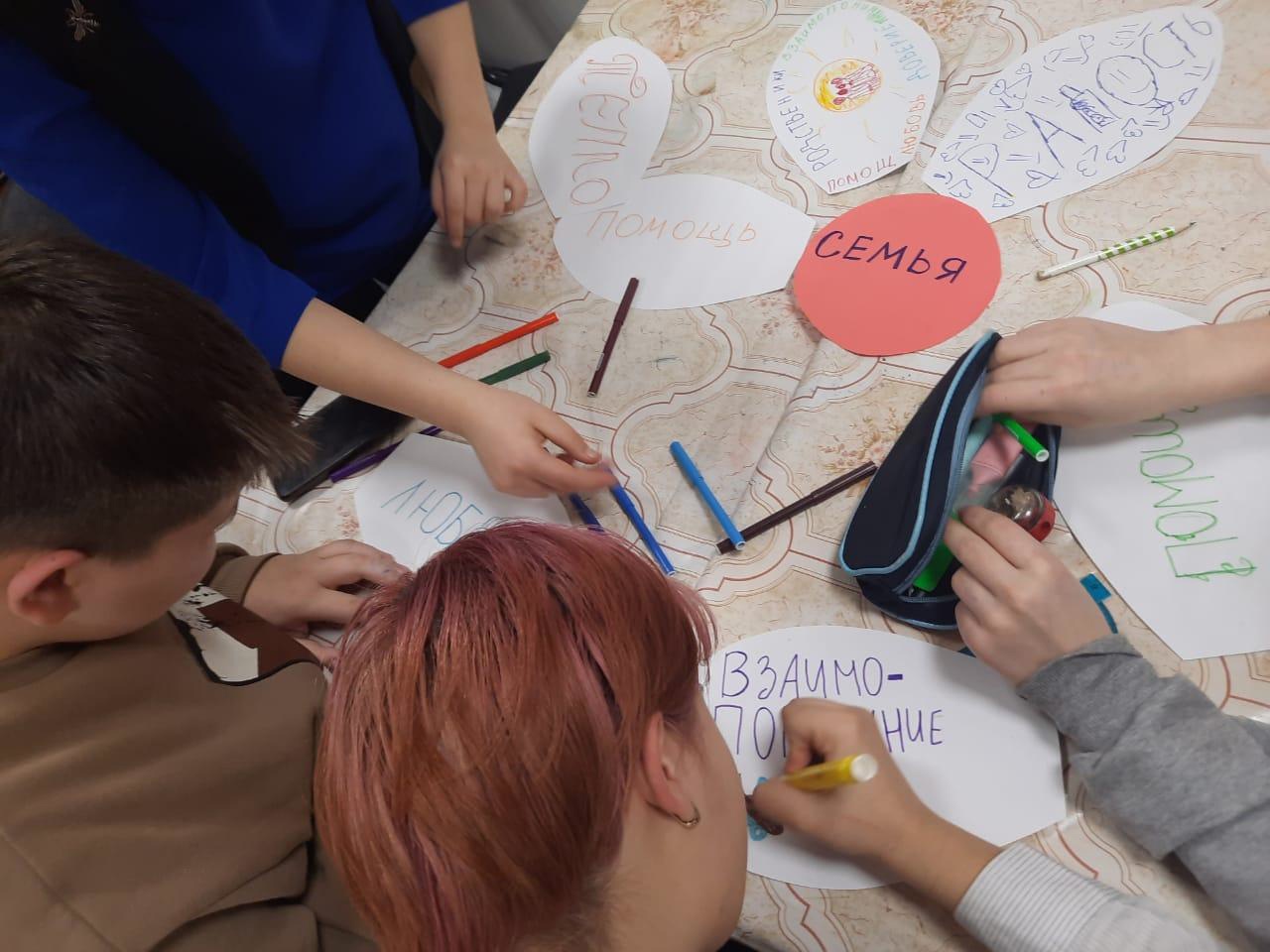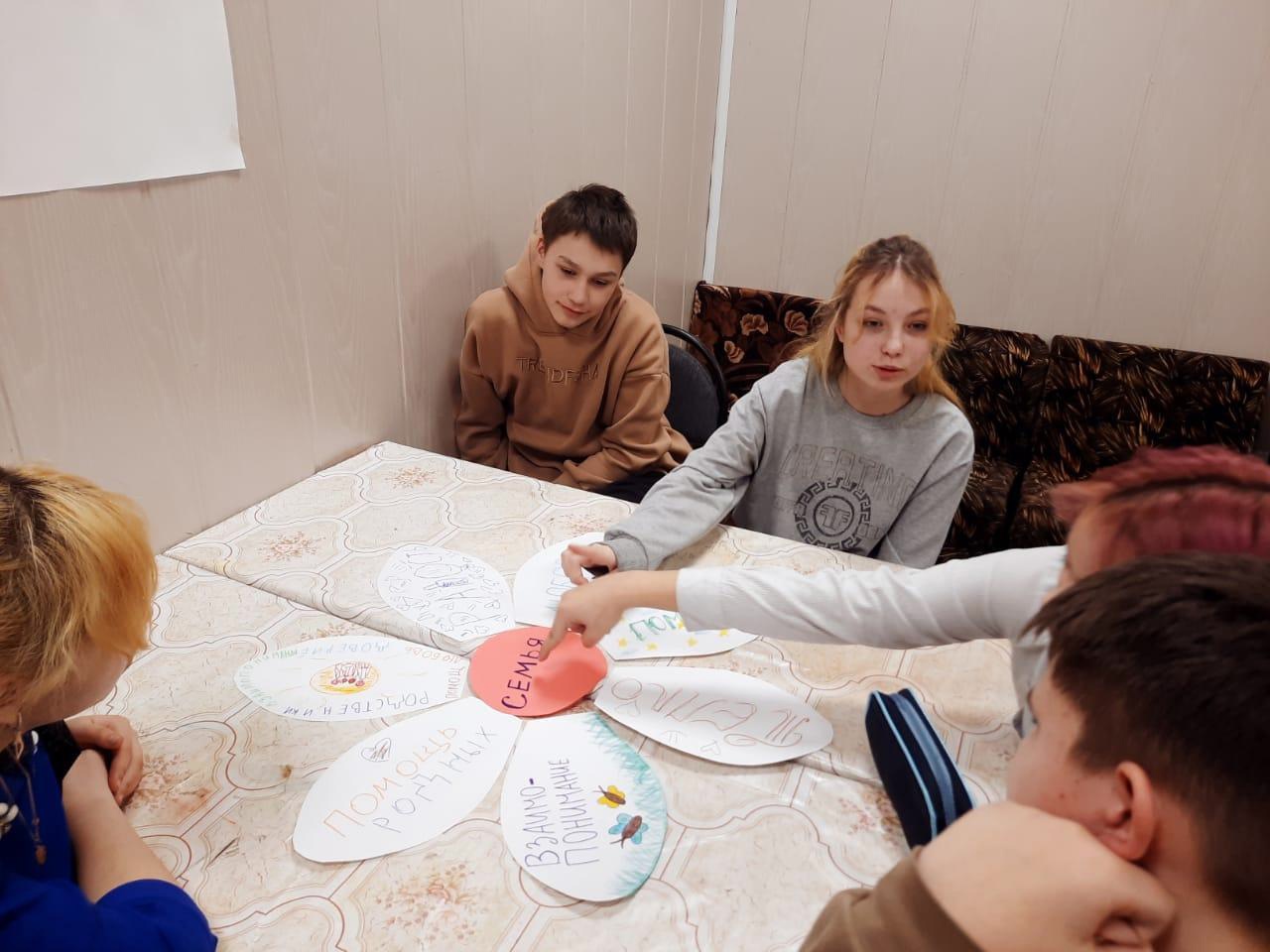 С целью воспитания и формирования понимания у воспитанников уважения к семейным ценностям и традициям педагог дополнительного образования Устинова Ирина Раверовна рассказала о значении семьи, о сохранении семейных традицией, об уважении друг к другу, потому что семья остается с нами навсегда и большего счастья в мире и в жизни не существует. Подводя итог занятия воспитанники написали на бумажных лепестках слова, являющиеся, по их мнению, основой семьи, получился цветок – ромашка, который является символом любви и верности.