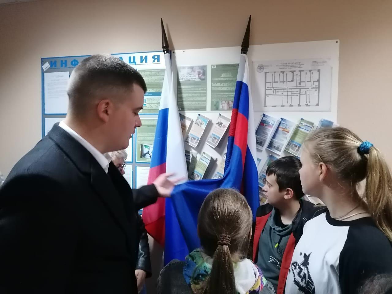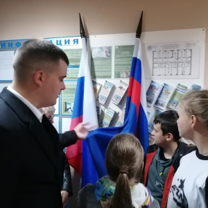 Дмитрий Сергеевич рассказал ребятам, что такое прокуратура, чем занимается эта организация, в чём заключается работа прокурора. Он показал флаг и форму, которую носит сотрудник прокуратуры.