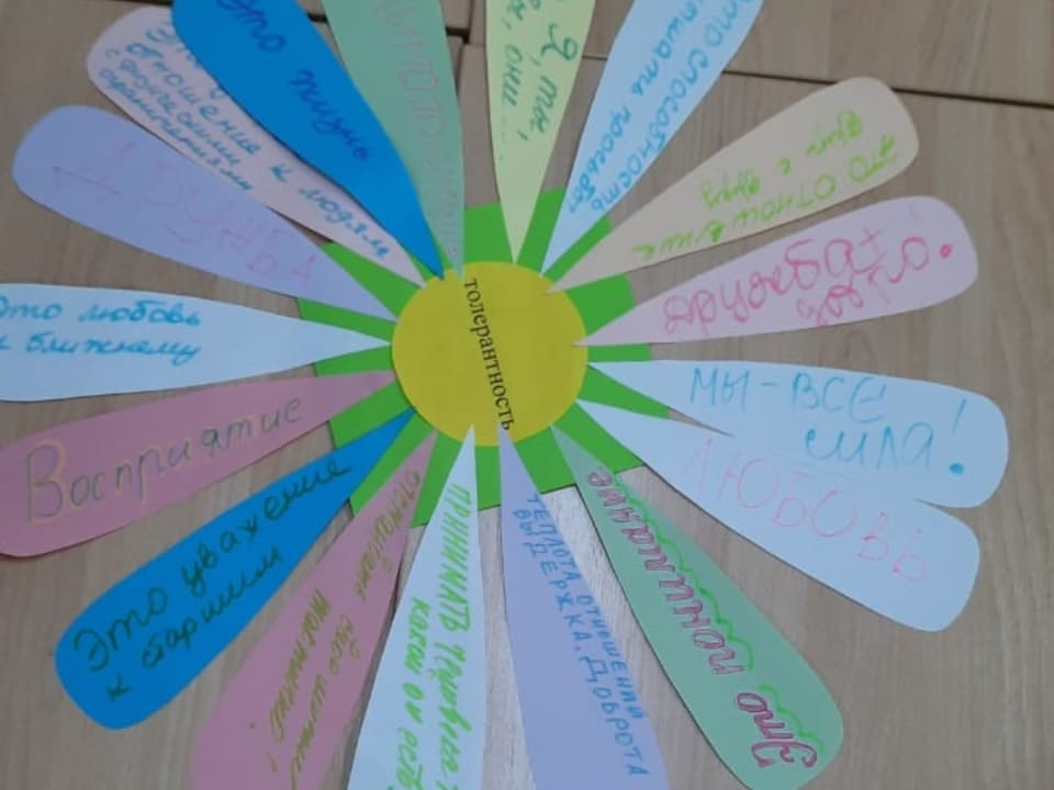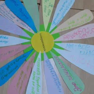 5 ноября 2021 года педагоги дополнительного образования МБУ ДО «ДДТ» в преддверии Международного дня толерантности стали участниками Круглого стола «Толерантность – это искусство жить в мире людей и идей». Ключевым вопросом мероприятия стал вопрос толерантности. Толерантность – это уважение, принятие и правильное понимание богатого многообразия культур нашего мира, форм самоуважения и способов проявления человеческой индивидуальности. В завершении работы участники Круглого стола обобщив мероприятие, закончили словами: «Все мы разные, но все мы вместе! Мы должны научить ребят быть толерантными. Только так всем нам удастся сберечь и укрепить самую большую драгоценность человечества – Мир на нашей Земле!». Педагоги определили основные принципы толерантности, обобщив все сказанное, изобразив слово «толерантность» в виде цветка, а черты толерантной личности в виде его лепестков.