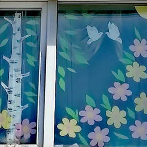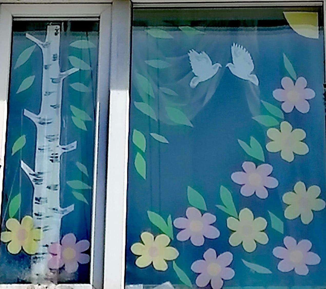 Воспитанники детского объединения "Волшебная кисточка" ( педагог дополнительного образования Солопова Г.В. ) Солопова Е. и Третьякова В. украсили свои окна к празднику всех трудящихся - 1 мая. Немного фантазии и цветная бумага в руках старательных девчонок превратились в яркие аппликации на стекле.