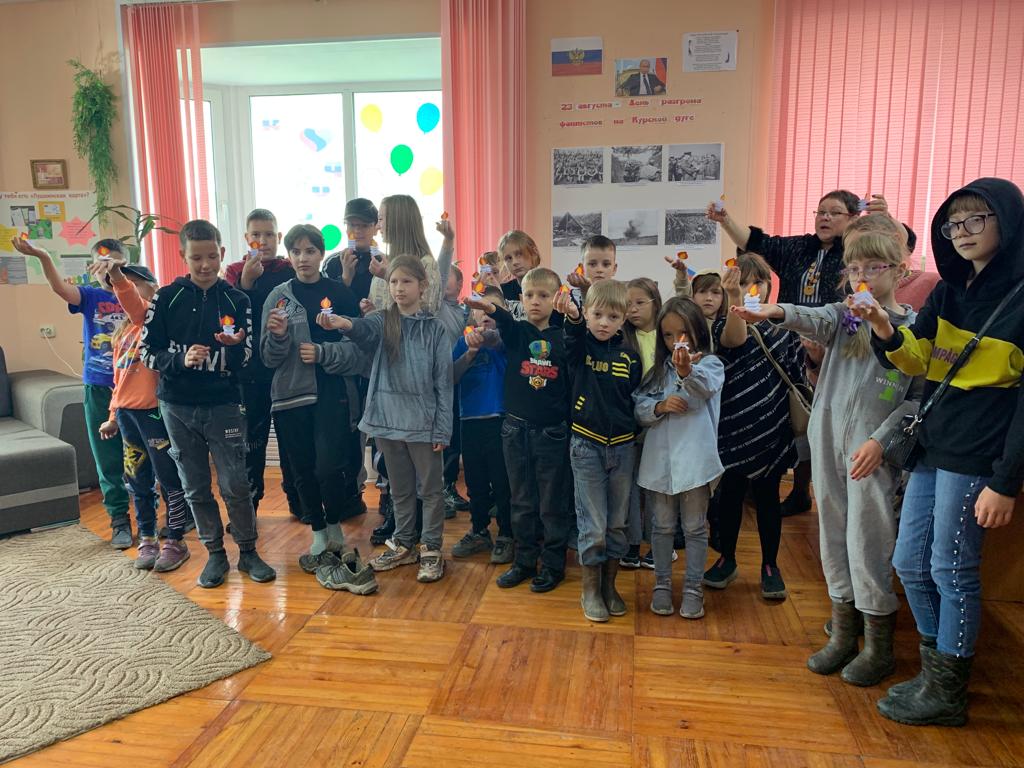 Заведующая детской библиотекой Шалагина Светлана Михайловна рассказала ребятам о Курской битве, которая длилась с 5 июля по 23 августа 1943 года и стала одним из ключевых сражений Великой отечественной войны, а педагоги дополнительного образования МБУ ДО «ДДТ» (Калмыкова С.А., Федорова Н.П., Ямковая Н.П.) провели мини мастер-класс «Свеча памяти».