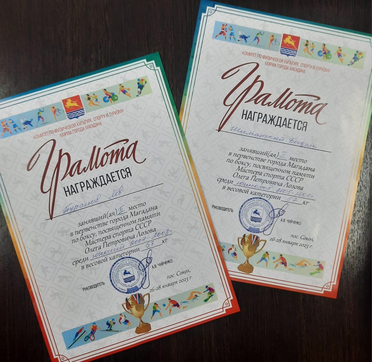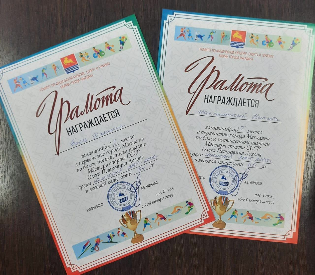 Воспитанники детского объединения «Бокс» муниципального бюджетного учреждения дополнительного образования «Дом детского творчества» муниципального образования «Сусуманский городской округ» - Троц Даниил, Туранов Лев, Шиманский Богдан, Шиманский Никита приняли участие в открытых соревнованиях «Первенства города Магадана по боксу памяти Мастера спорта СССР Лозова Олега Петровича», которые проходили в п. Сокол Магаданской области с 26 по 27 января 2023 года. По результатам соревнований наши воспитанники показали отличные результаты и завоевали 4 медали: 2 золотых и 2 серебряных. Результаты достигнутых успехов воспитанниками детского объединения «Бокс» МБУ ДО «ДДТ» в открытых соревнованиях «Первенства города Магадана по боксу памяти Мастера спорта СССР Лозова Олега Петровича»: Троц Даниил - 1 место, среди юниоров 2005 – 2006 г., в весовой категории 54 кг; Шиманский Никита - 1 место среди юниоров 2005 – 2006 г., в весовой категории 60 кг; Шиманский Богдан - 2 место среди юниоров 2005 – 2006 г., в весовой категории 57 кг; Туранов Лев - 2 место среди юниоров 2007– 2008 г., в весовой категории 57 кг. Поздравляем воспитанников детского объединения «Бокс» и педагога дополнительного образования Голуба Б.В. с успешным выступлением на соревнованиях!