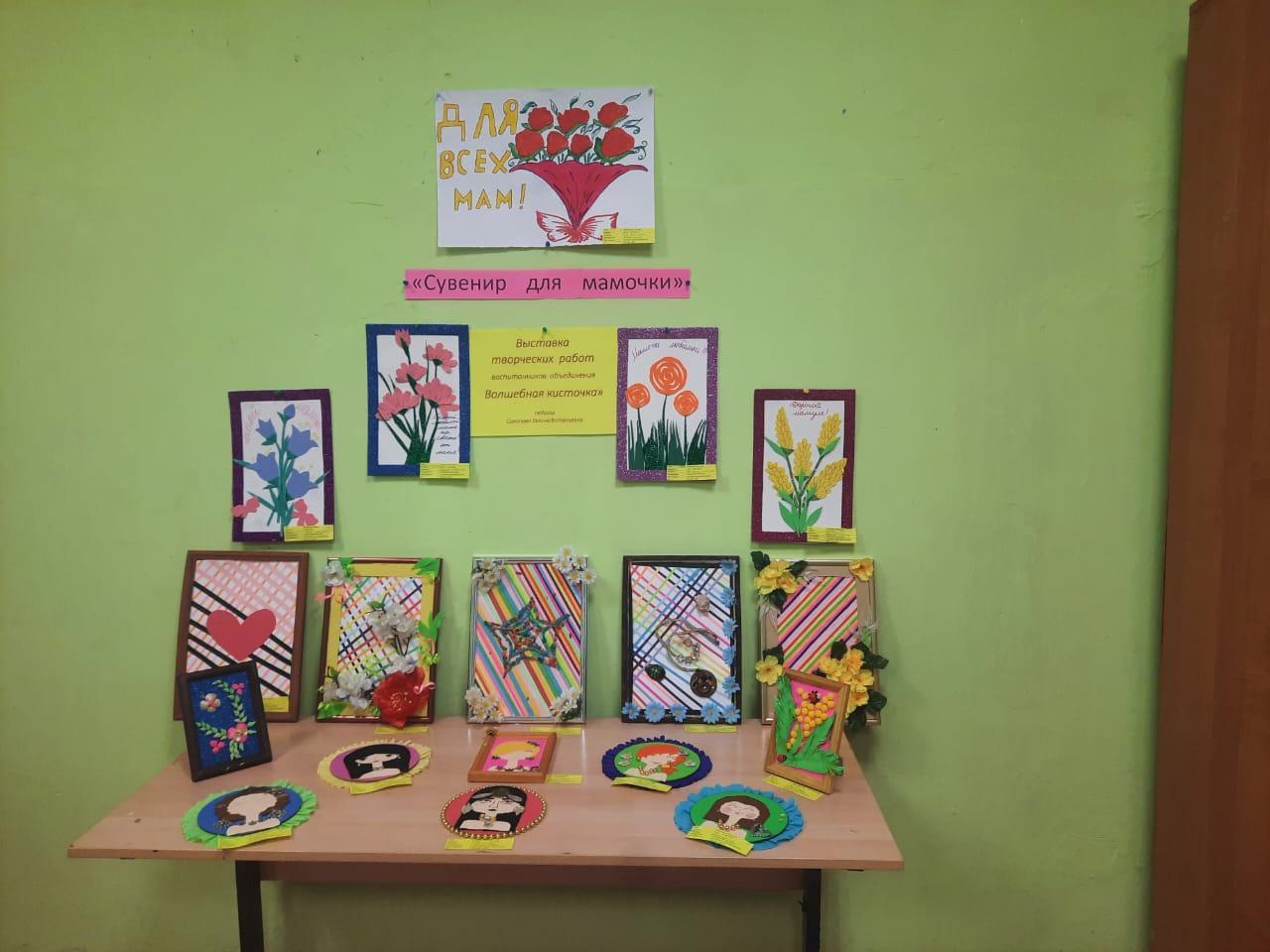 В ожидании праздника педагог дополнительного образования Солопова Галина Витальевна организовала выставку детских работ «Сувенир для мам». Воспитанники детского объединения старались порадовать мам замечательными рисунками, открытками и поделками. Дети с трепетным и волнительным чувством подошли к работе и поэтому их рисунки и поделки получились яркими, красочными, разнообразными!