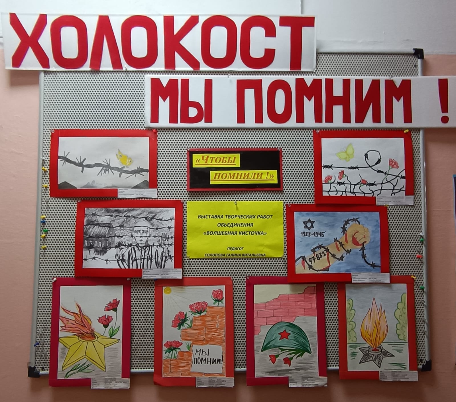 В рамках недели памяти жертв Холокоста в объединении «Волшебная кисточка» под руководством педагога Солоповой Галины Витальевны организована тематическая выставка рисунков «Холокост. Мы помним!».
